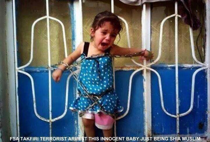 De acordo com a página do Facebook da Verdade Síria, a foto acima é de uma criança que vive na região de Deir ez-Zor, no leste da Síria, na fronteira com o Iraque. Ela foi amarrada pelos membros do "Exército Sírio Livre", o mesmo que tem o apoio do governo dos EUA (administração Obama), e que é constituído na sua maioria por jihadistas sunitas extrangeiros.