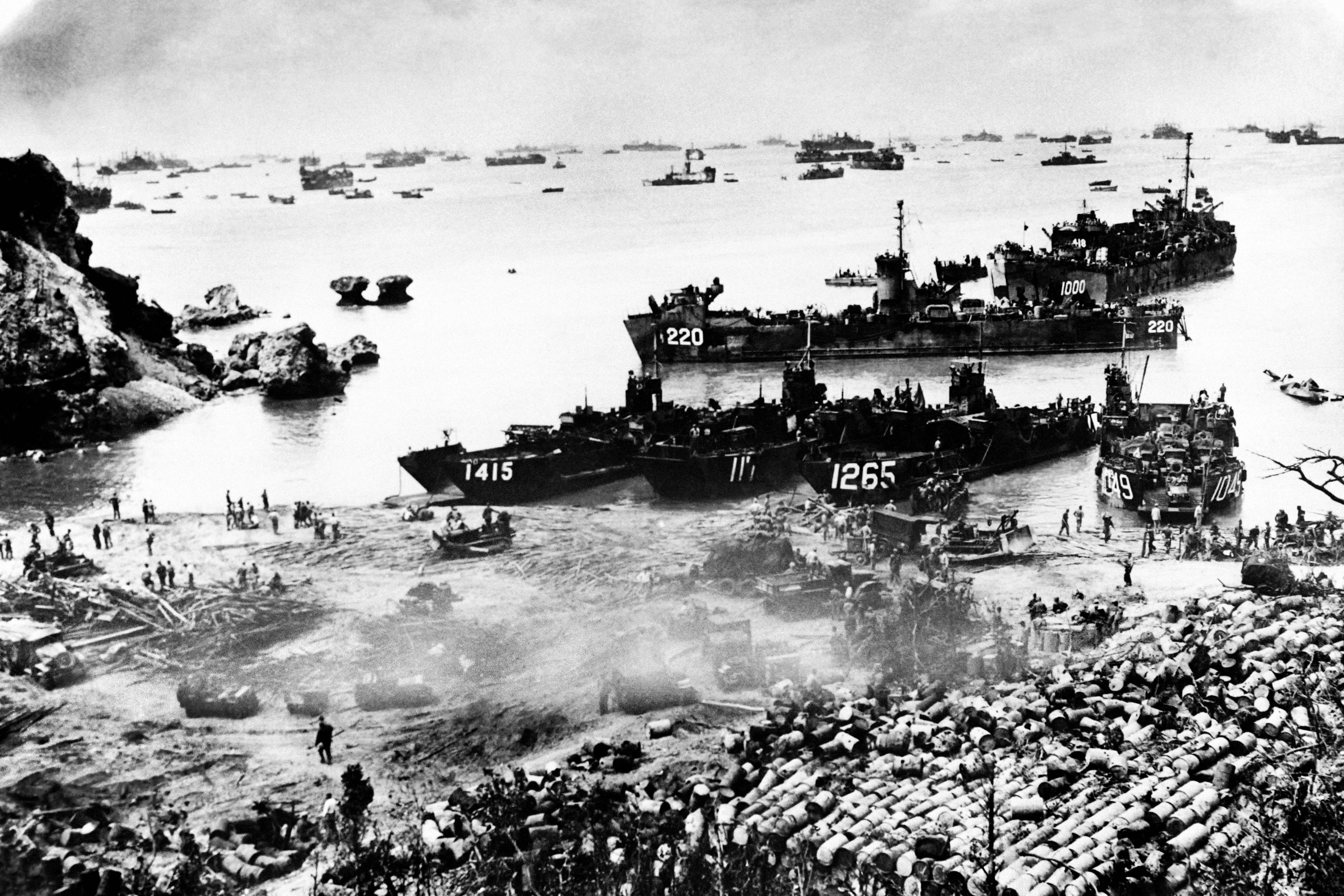 Os navios de guerra dos EUA em Okinawa durante o desembarque da tropa americana no Japão em 1945